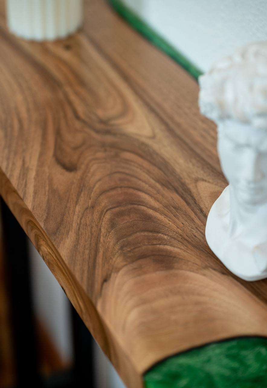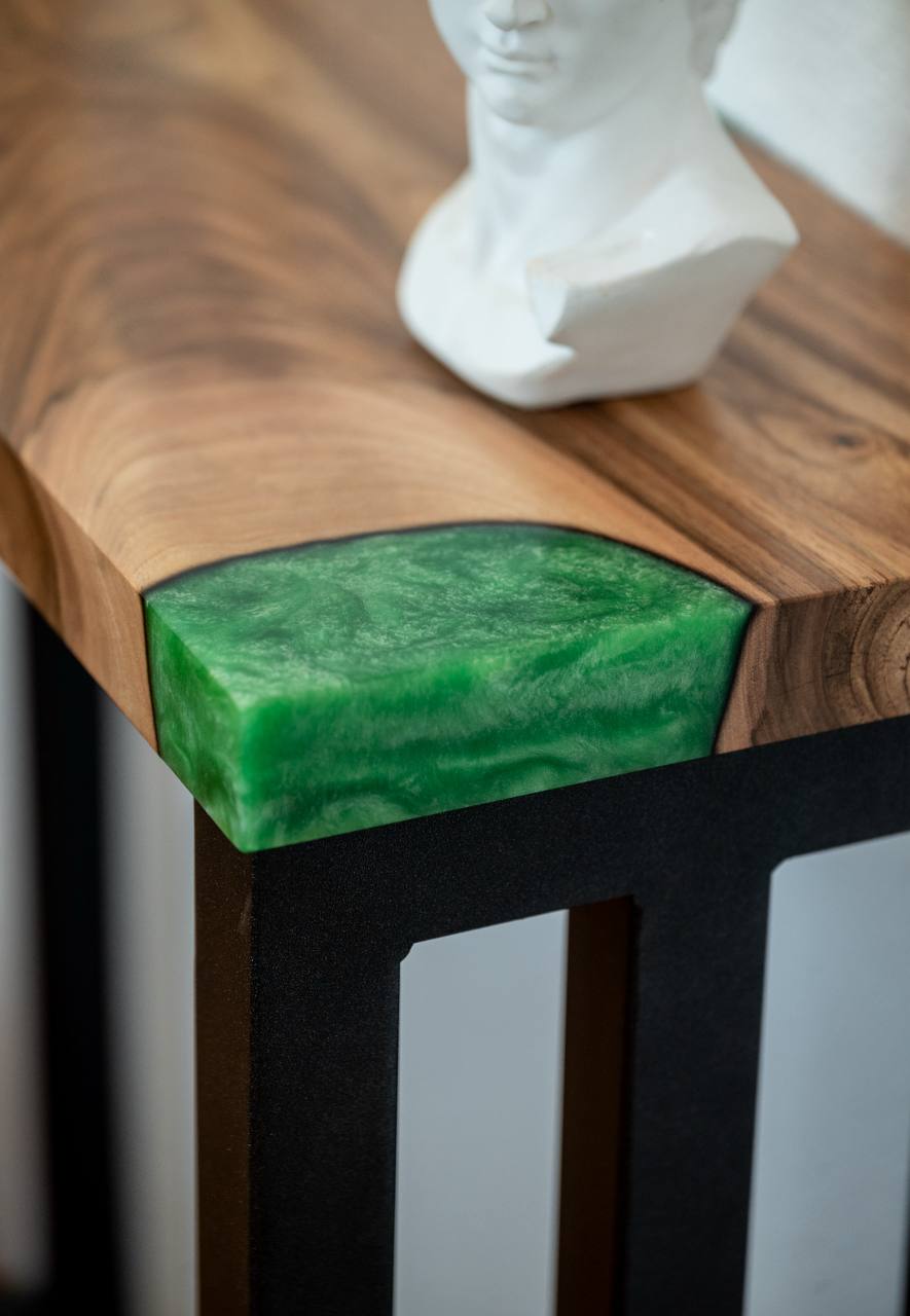 Bring a touch of nature into your home with this handcrafted console table, featuring rich wood tones and a vibrant green epoxy inlay. The flowing resin mimics forest streams, blending seamlessly with the natural wood to create a bold and organic statement piece.